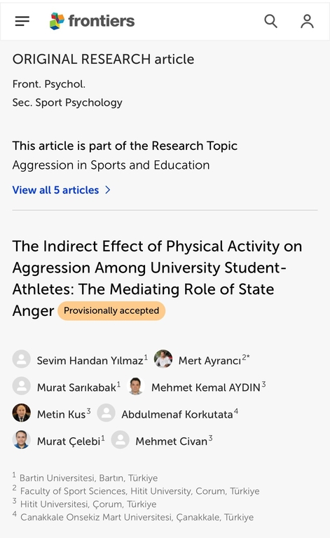 The faculty members of the Department of Physical Education and Sports have achieved a significant scientific milestone with their article published in Frontiers in Psychology, a prestigious journal ranked in the Q1 category. The study, titled "The Indirect Effect of Physical Activity on Aggression Among University Student-Athletes: The Mediating Role of State Anger," was authored by Head of Department Asst. Prof. Dr. Murat ÇELEBİ, Deputy Head of Department Assoc. Prof. Dr. Sevim Handan YILMAZ, and faculty member Assoc. Prof. Dr. Murat SARIKABAK. The research provides an in-depth analysis of the critical relationships between physical activity, aggression, and state anger among university student-athletes. This high-quality study significantly contributes to the scientific literature and enhances Bartın University's international academic visibility, once again demonstrating the faculty's leading role in the field of sports sciences.
